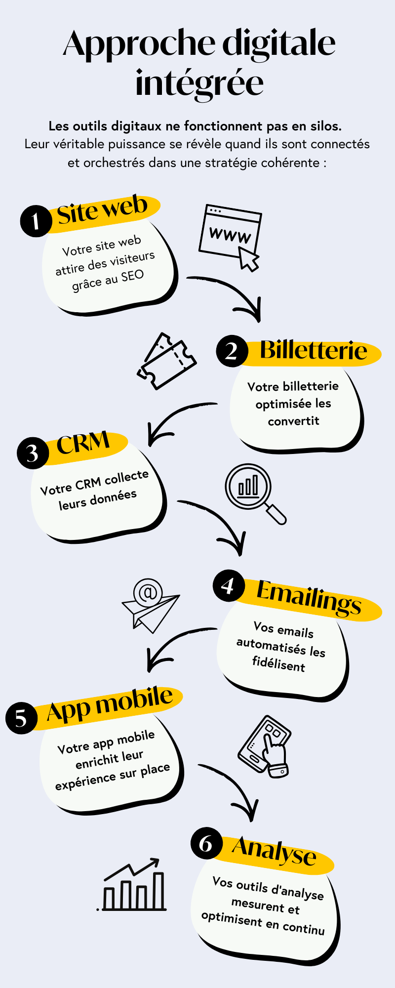 Site web clair + billetterie fluide + base email. Ce trio couvre déjà acquisition, conversion et fidélisation.
